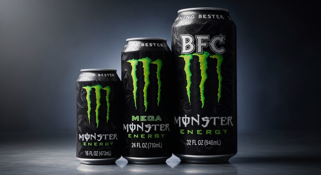 When we talk Monster, we’re talkin’ giants. Like, cans that make your hand feel tiny and your wrist question its existence. A standard Monster Energy can comes in 16 oz (473 ml), but there’s also the mega 24 oz (710 ml) version that feels like you’re holding a soda skyscraper.