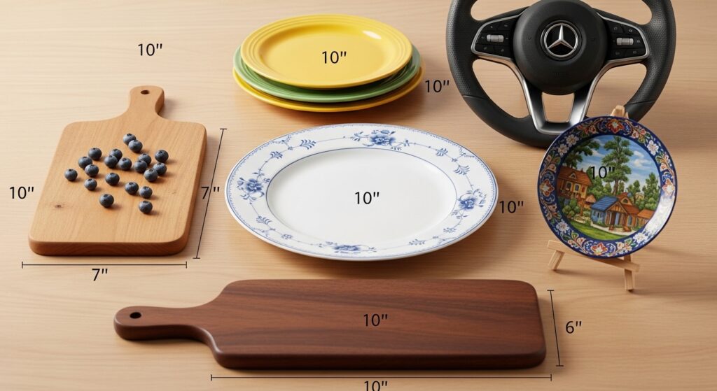 Visualizing 10 inches in your daily environment is surprisingly easy when you look at dinner plates, which historically are about 9 inches in diameter. That’s slightly smaller than a 10-inch measurement, so if you imagine adding a bit of extra space, you’re at the perfect scale for a small family meal.
