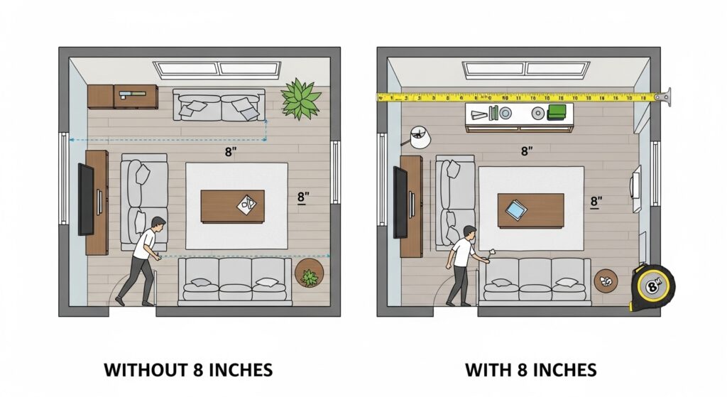 In Furniture Layout, 8 inches can be the clearance between a sofa and a coffee table. It can be the depth of a narrow shelf. It can be the breathing room in a hallway that suddenly feels too tight.