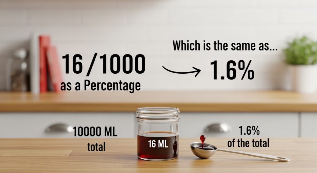Now here’s the gentle magic. The Fraction (16/1000) is a Ratio, a quiet comparison between 16 parts and 1000 parts. To turn it into a Percentage, we go through a Value conversion process. And that process isn’t as scary as it sounds, promise.
